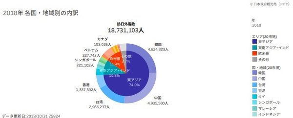 日本政府観光局(JNTO)が発表した訪日外客数の動向によると、2019年2月の訪日外客数は前年同月比で3.8%増加の約260万4,000人で、2月としては過去最高を記録。アジアに関しては旧正月が2月上旬となった影響もあり、特にベトナムは前年同月比60%を超える伸び率を記録しました。