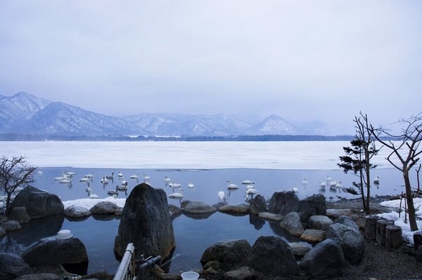 さて、冬の屈斜路湖の主役といえば白鳥です。毎年10月下旬になるとシベリアから渡ってきた白鳥たちが姿を現し、4月末ごろまで湖畔の景色に優美な華をそえます。そんな風物詩を目の前に湯浴みを楽しむことができるのが、ここ屈斜路湖の温泉です。