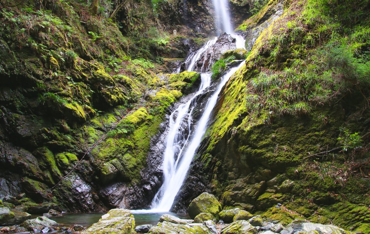「雨乞の滝」は、1990年に制定された「日本の滝百選」にも選ばれており、神山町の鮎喰川支流にある滝の一つ。3段の雌滝と雄滝の2つの滝があります。高さはそれぞれ45mと27m。徳島市内からは車で約50分の山の中にあり、駐車場から700~800mの急な坂道を上ると現れてきます。