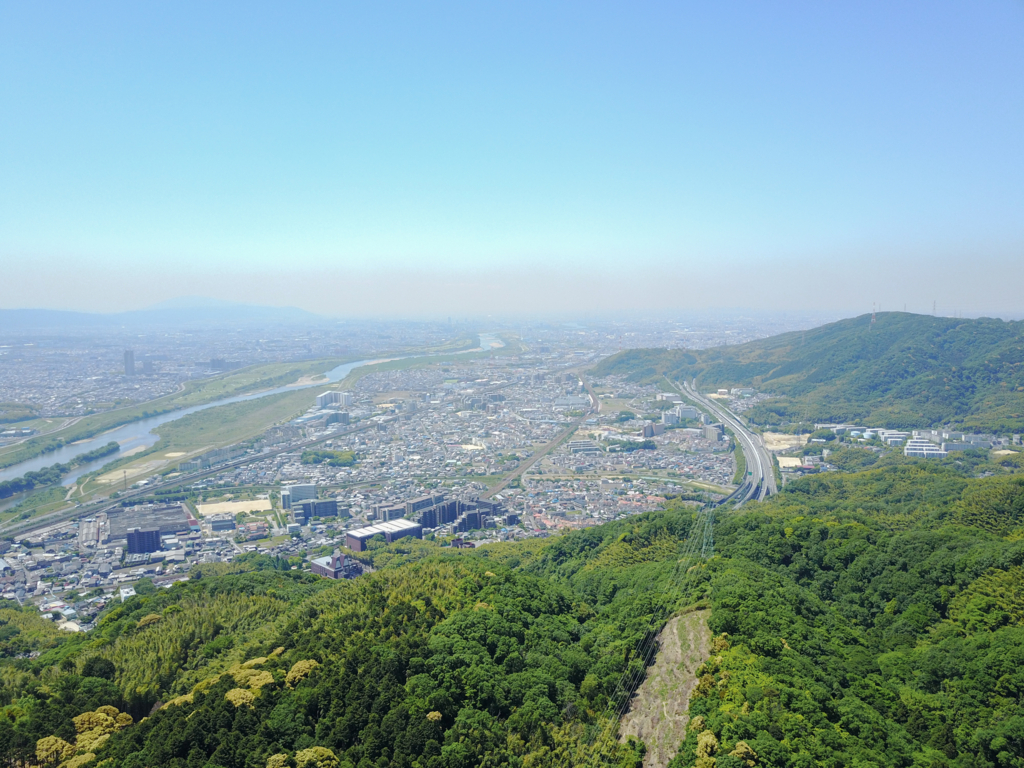 ハイキングといえばやっぱり絶景は見逃せません。山の7合目、三川合流展望台 (青木葉谷展望台:あおきばだにてんぼうだい)からは、南東には石清水八幡宮のある男山が見えます。その手前には木津川、宇治川、桂川の3河川が合流し、大パノラマが広がります!