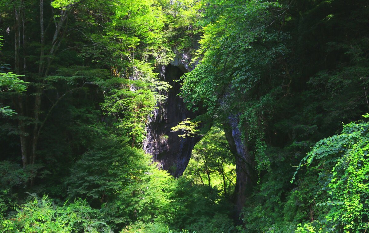 「羅生門」は、太古の巨大な鍾乳洞の一部が陥没し、石灰岩がアーチ状に残ったもので、高さ40mにも達します。残念ながら、安全性の面からアーチをくぐることはできません。近くの展望台からはアーチを眺められますよ。