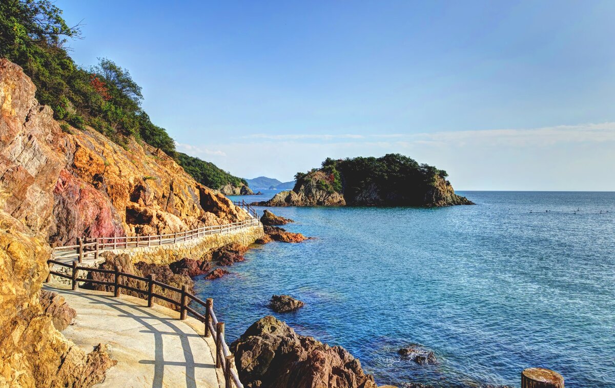 太古の火山活動により誕生したこの島には、長年の波に洗われたできた奇岩が数多くあります。特に島の南側の海岸線沿いに見られる、青、赤、黄、白、黒の5色の岩が約1kmにもわたって続く「五色岩」は絶景です。また、龍が出没するといわれた穴もあるので要チェックです。