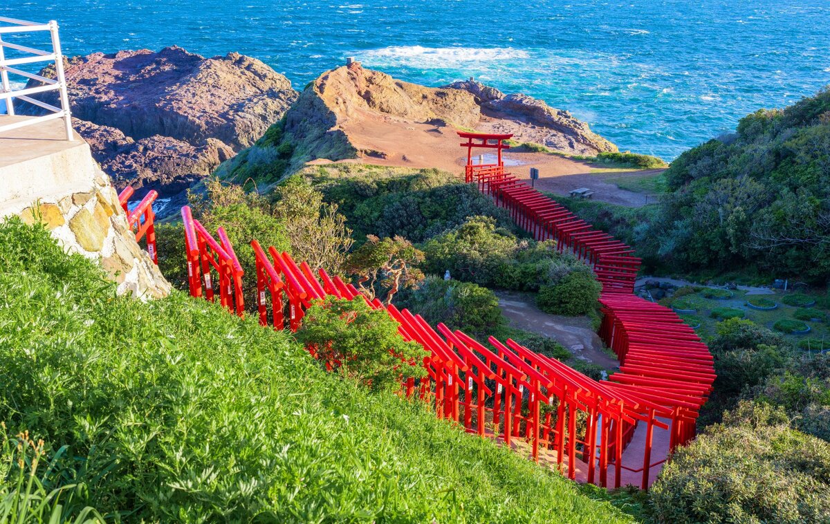 「元乃隅神社」は、日本海を望む岬の先端、断崖の上に建てられており、123基の朱塗りの鳥居が神社に向かって100m以上続いています。本殿は大きくはないですが、100を超える鳥居をくぐっていくため、不思議な達成感がえられ、パワーが感じられます。