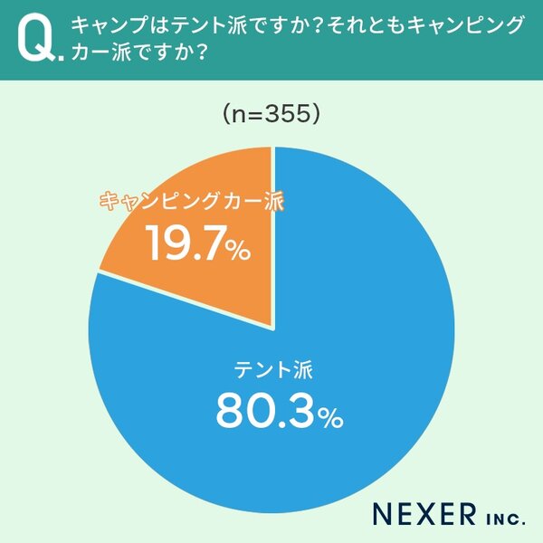 まず注目すべきは、「キャンプはテント派?キャンピングカー派?」という質問への回答。なんとテント派が80.3%、キャンピングカー派が19.7%という結果となりました。