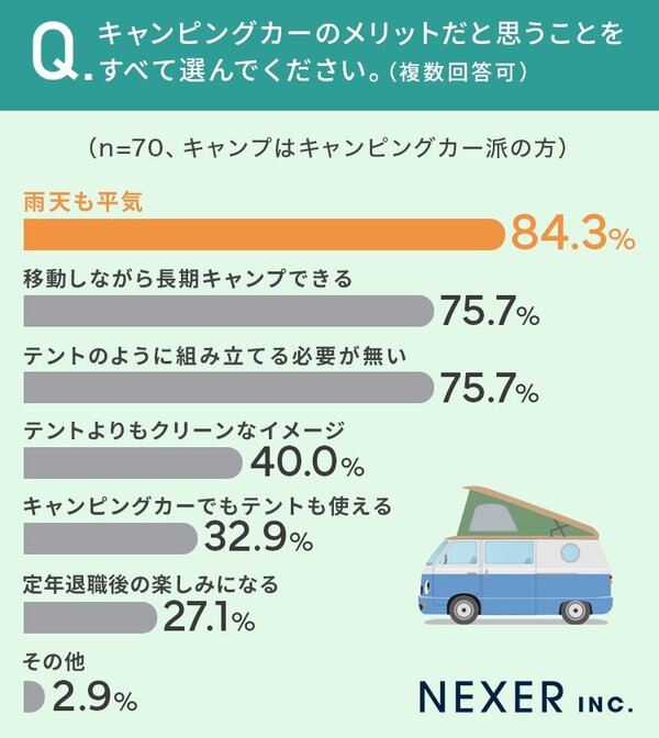 さらに「キャンピングカー派」のかたたちに、キャンピングカーのメリットを聞いたところ、特に多かったのが「雨天も平気」(84.3%)でした。続いて「移動しながら長期キャンプできる」と「テントのように組み立てる必要が無い」が同率で75.5%と多くの声が集まっています。