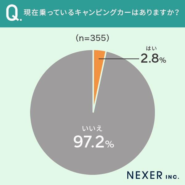 意外かもしれませんが、今回の調査では「現在キャンピングカーに乗っている」と回答したかたは2.8%とごくわずかでした。つまり「興味はある」「魅力も感じる」が、実際に所有している人は少数派という現実が浮き彫りになっています。