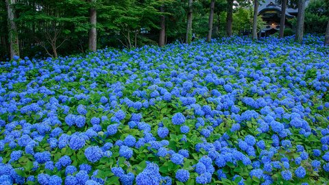 京都府の「三室戸寺」では、杉木立が広がる境内南側のあじさい園で、希少品種の七段花など約50種類2万株が京都随一のスケールで咲き誇ります。