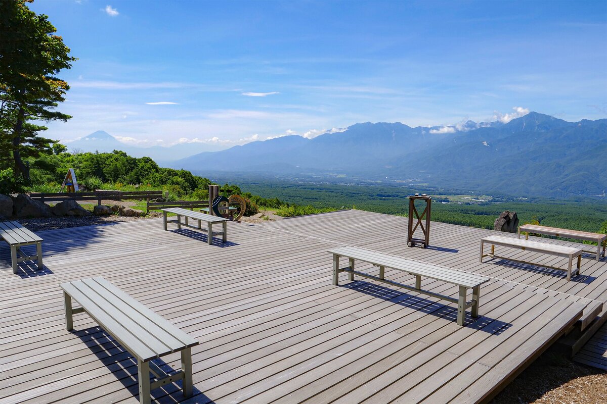 天空カートで上った「富士見高原創造の森」の展望テラスでは、富士山、南アルプス、北アルプスという日本を代表する山々を見渡すことができます。360度に広がる雄大な景色は、まさに天空の特等席から眺める自然の大劇場といえるでしょう。