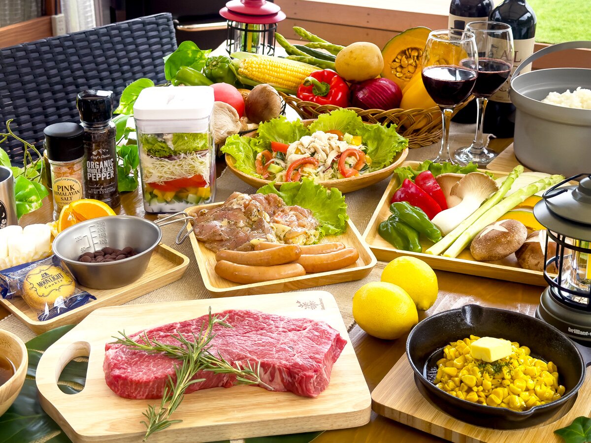 夕暮れ時からスタートする「手ぶらバーベキュー」では、日光のブランド牛「霧降高原牛」のステーキが目玉メニュー。柔らかく上質な肉質は、普段のバーベキューでは味わえない贅沢さです。