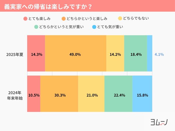 興味深い発見として、義実家への帰省について「楽しみ」と答えた方は、夏が63.3%だったのに対し、2024年〜2025年の年末年始調査では40.8%にとどまっていました。