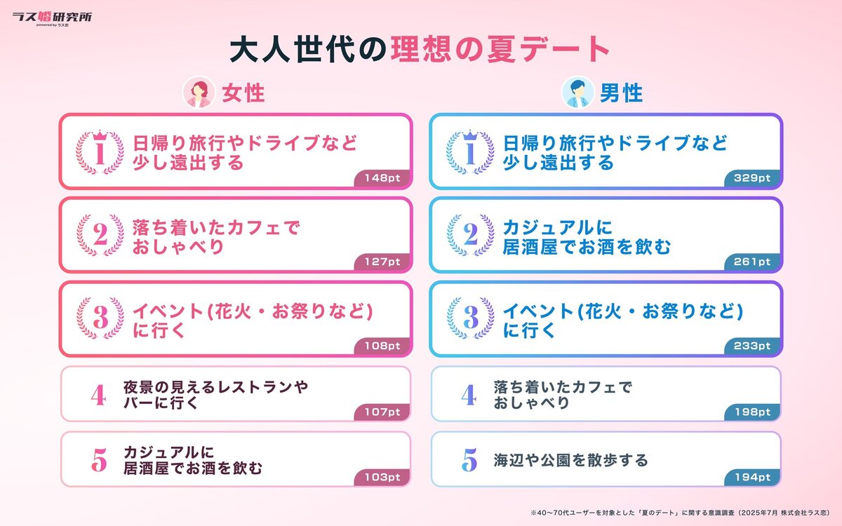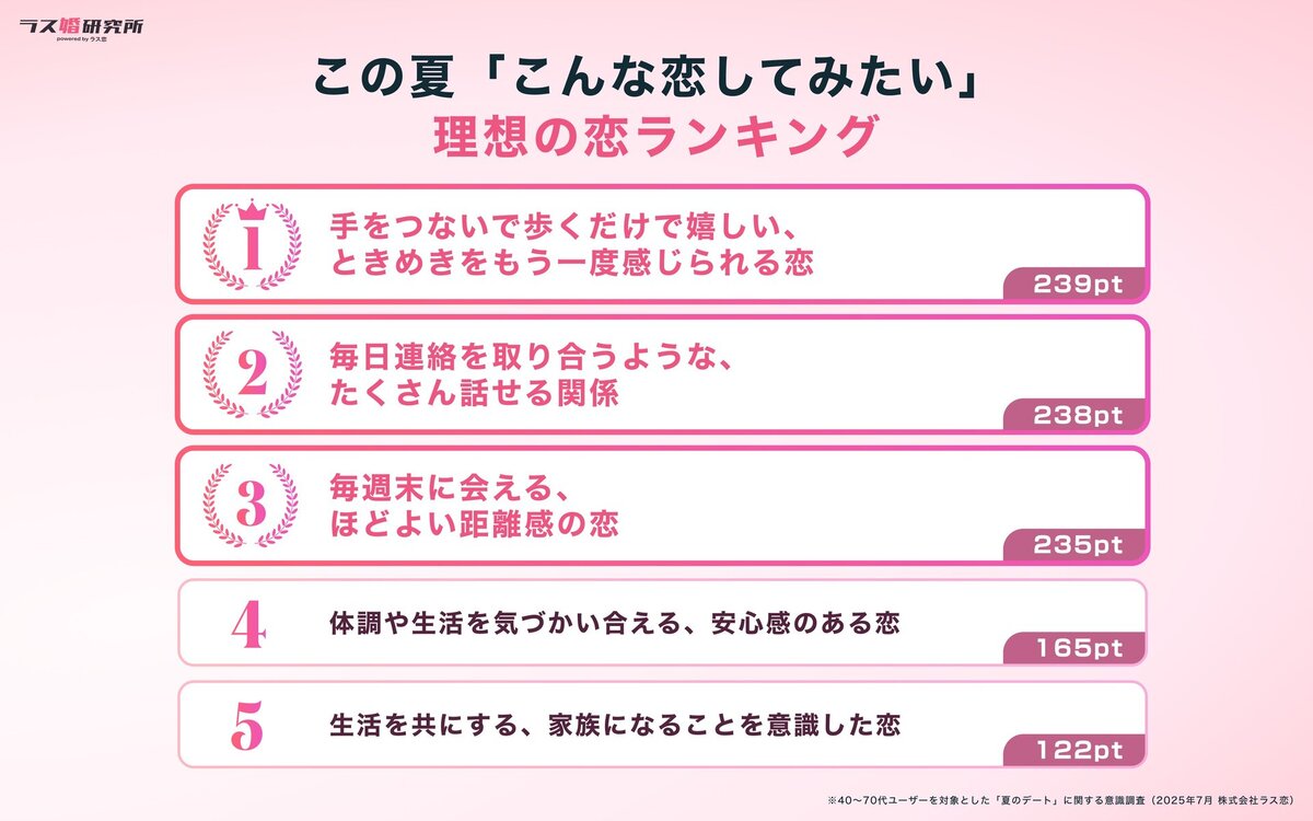 40歳以上を対象としたマッチングアプリ「ラス恋」が2025年7月に実施した調査では、1,133名のユーザーから貴重な声が集まり、大人世代の恋愛観と理想のデートスタイルに関する興味深いデータが明らかになりました。この調査結果を通じて、旅行好きの皆さんにとって新たな視点での夏旅の楽しみ方をご提案いたします。