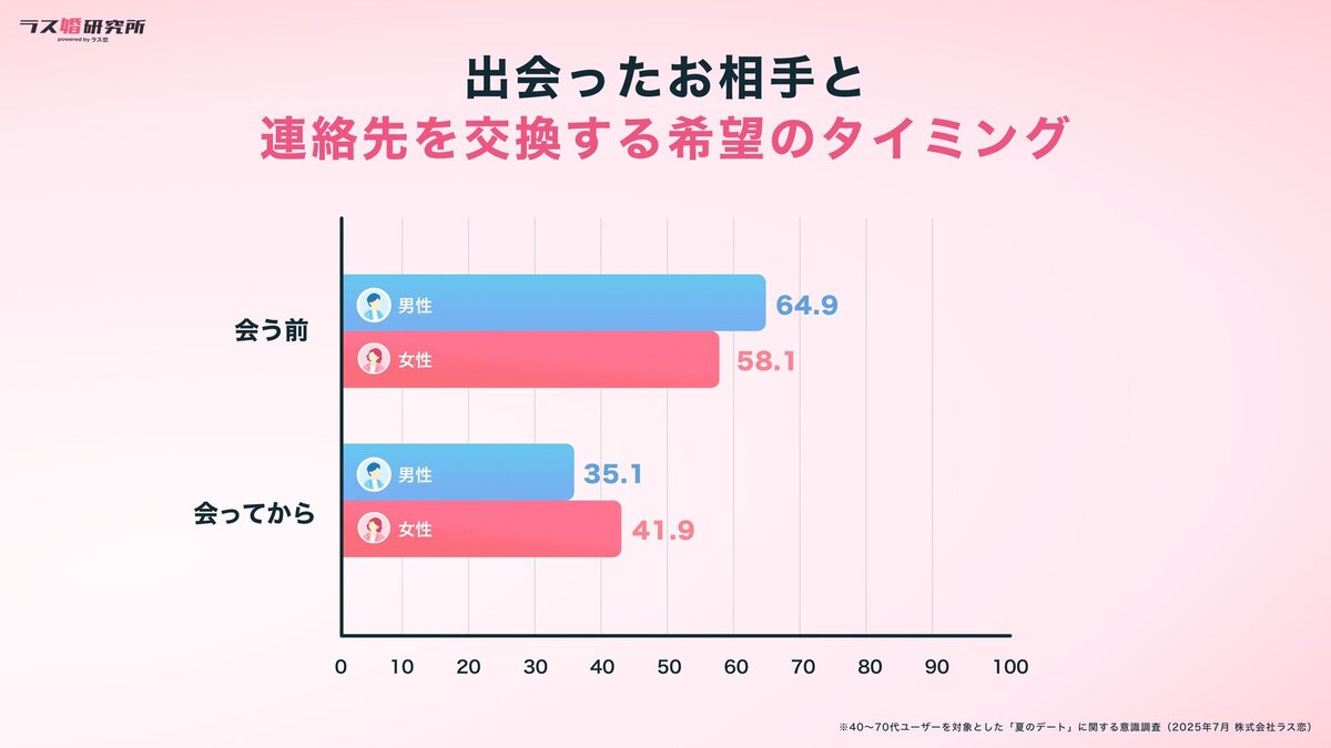 調査結果で興味深い男女差が明らかになったのが、連絡先交換のタイミングに関する考え方です。男性の64.9%が「会う前」の交換を希望する一方、女性は41.9%が「会った後」のタイミングを支持しており、男女での差が見られました。