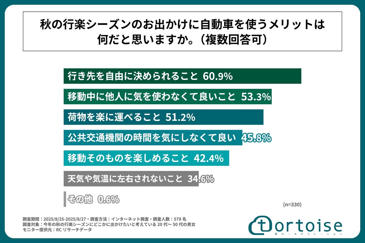 調査では「秋の行楽シーズンのお出かけに自動車を使うメリット」についても尋ねており、上位3つのメリットが浮き彫りになりました。