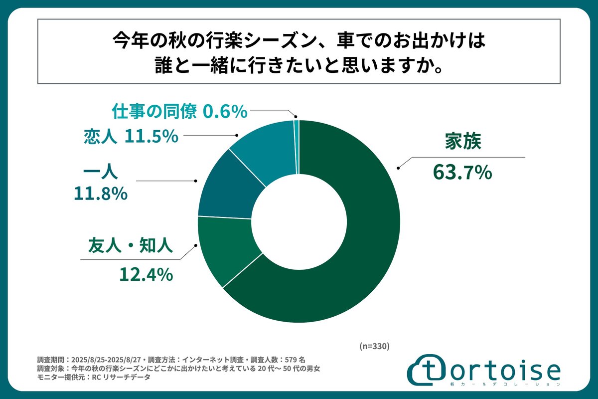 調査結果によると、秋の行楽シーズンに車で一緒に出かけたい相手の第1位は「家族」で63.7%、第2位が「友人・知人」で12.4%、そして第3位が「一人」で11.8%という結果になりました。