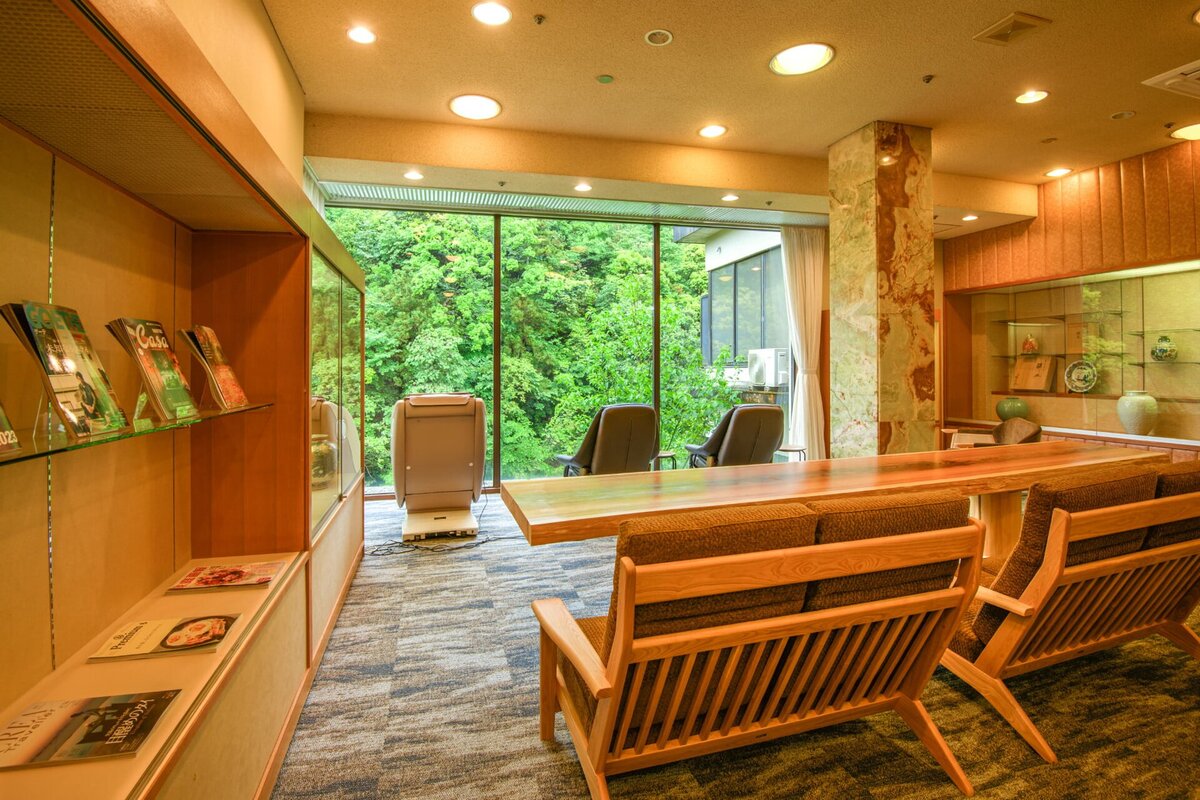 ジュースやコーヒー等が楽しめる「フリードリンクスペース」、ゆっくりと読書ができる「ライブラリー」、鶴仙渓を眺望しながらほっと一息つける「リクライニングチェア」など、充実した設備がそろっています。「マッサージチェア」も設置されており、客室とはまた違った空間でリラックスタイムを過ごすことができます。