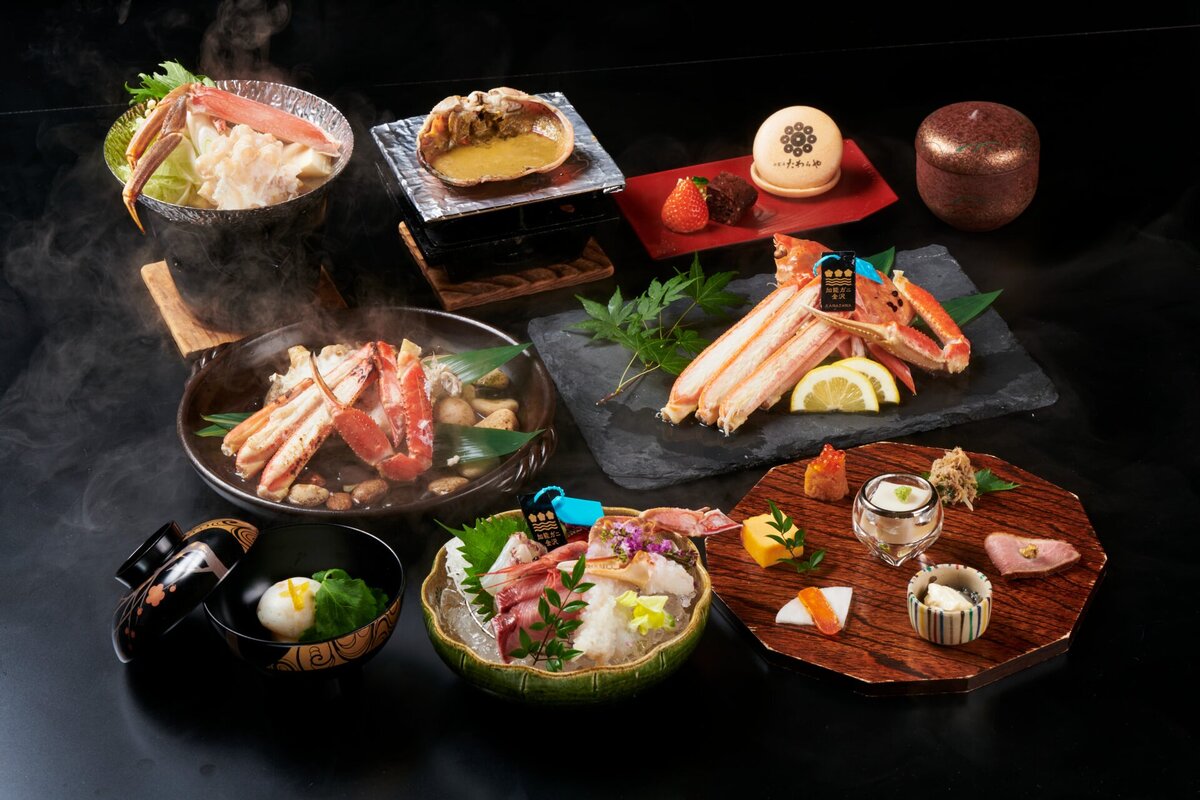 のどぐろの宝楽焼や能登牛など、地元の厳選食材を使った特選会席に加えて、11月からは冬季限定で、地蟹(加能ガニ)をふんだんに使った懐石料理もスタート。石川県が誇るブランド蟹「加能ガニ」は、11月〜3月の限定で提供される冬の味覚の王様です。