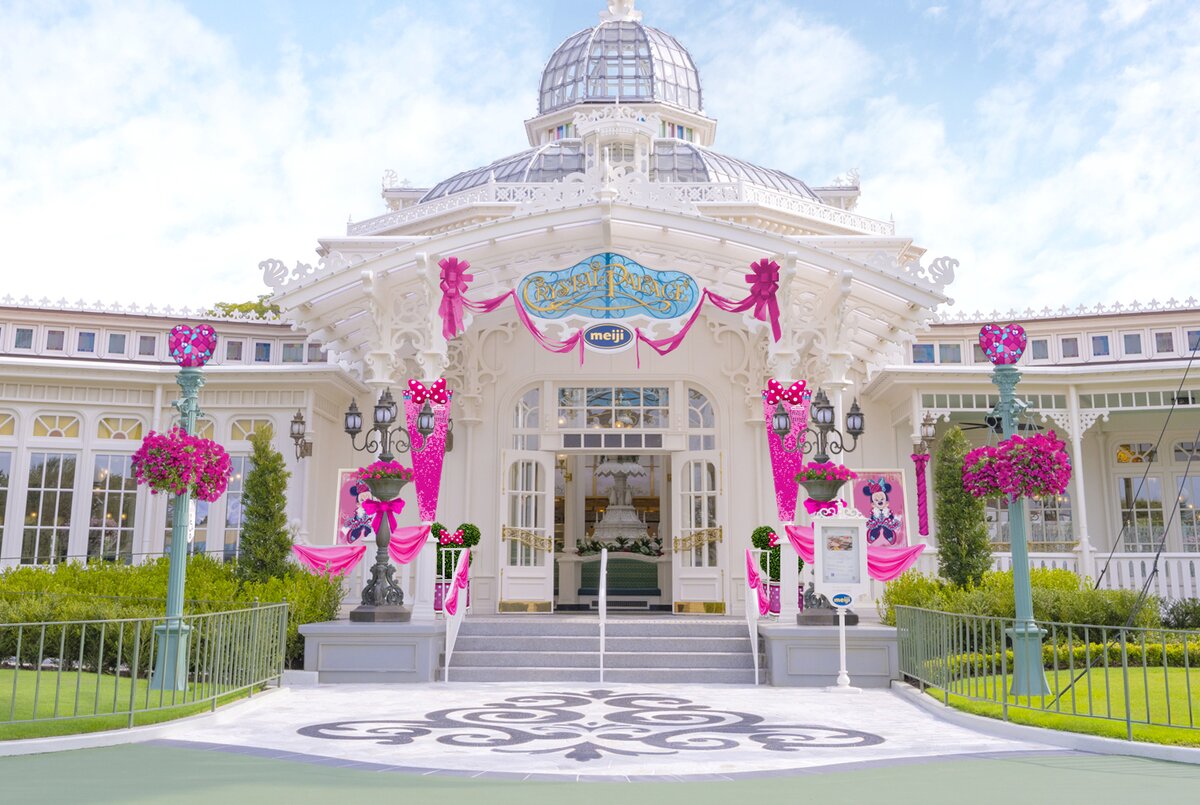 エントランス前にはミニーの花壇が登場し、ワールドバザール中央には大きなリボンのモニュメントが設置されます。シンデレラ城周辺もリボンやドット柄の装飾で彩られ、パーク全体がミニーの世界観に包まれます。