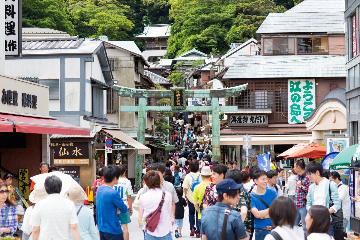 江島神社へと続く「弁財天仲見世通り」は、旅館や飲食店が軒を連ね、散策するだけでも楽しい活気ある参道です。名物のしらすや海鮮料理を味わいながら、買い物を楽しめます。日本三大弁財天のひとつを祀る「奉安殿」など、歴史を感じられるスポットも点在しています。