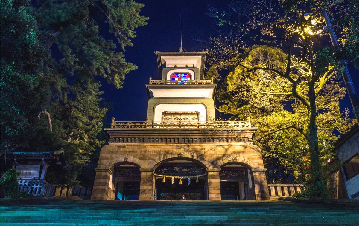 金沢駅からほど近い場所にある「尾山神社」は、加賀藩初代藩主の前田利家公とその正室お松の方を祀る神社です。ここでまず目を引くのが独特の神門。
