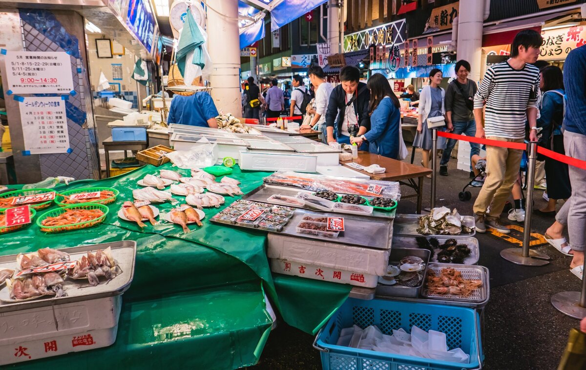 尾山神社の静かな歴史美を満喫したら、次は金沢の賑やかな台所「近江町市場」へ足を運びましょう。ここは約300年の歴史を持つ市場で、新海産物や地元で採れた加賀野菜が豊富に並び、地元民はもちろん観光客にも大人気です。