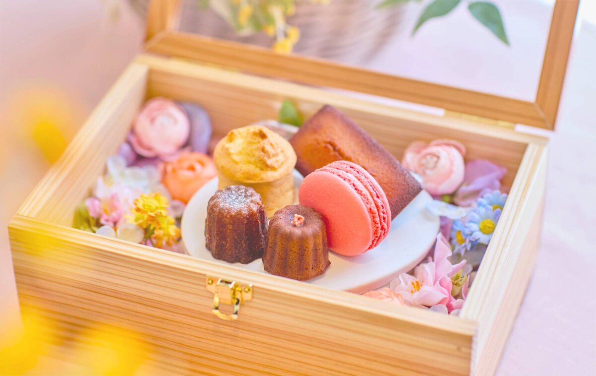 思わずカメラを構える、花に囲まれたスイーツボックス