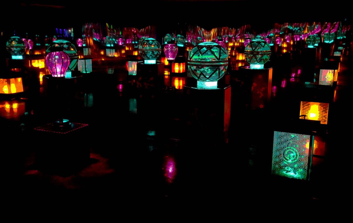 本展で初めてお披露目となる新作エリア。手毬・ぼんぼり・行燈をモチーフにした水槽が、四面を鏡で囲まれた空間の中に立ち並びます。幻想的な灯りが鏡の中へと無限に連なっていく光景は、現実と幻想の境界線が溶けていくような感覚を覚えます。