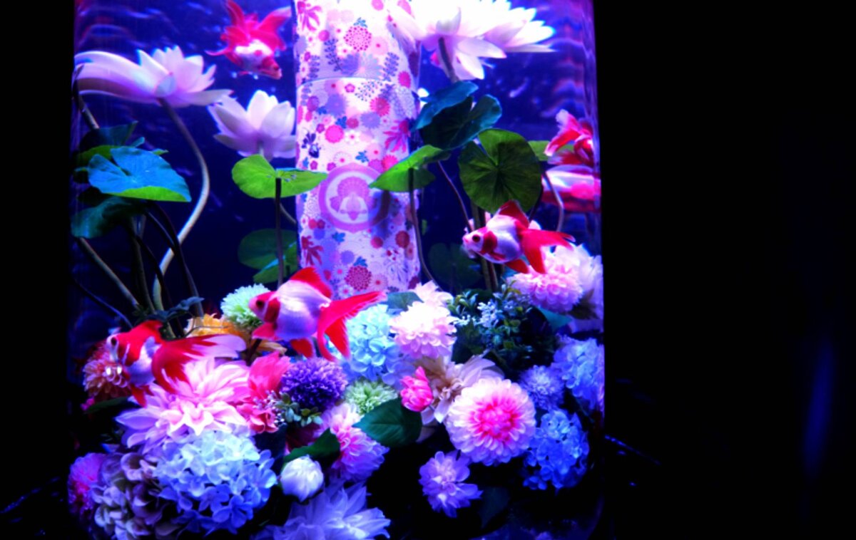 日本の四季と花文化を愛でながら泳ぐ金魚の姿は、いわば多彩な花と金魚の饗演、まるで生きた絵画のようです。