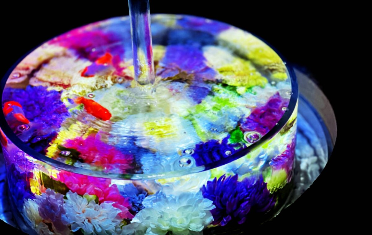 花と金魚が互いを引き立て合う、華やかな三作品が集うエリアです。様々な花で空間を埋め尽くす「花舞」、日本庭園の水琴を花で表現した「金魚の水琴」、そして伝統工芸・九谷焼と花を融合させた「九谷五彩金魚」。三者三様の表現が、ここに集結します。