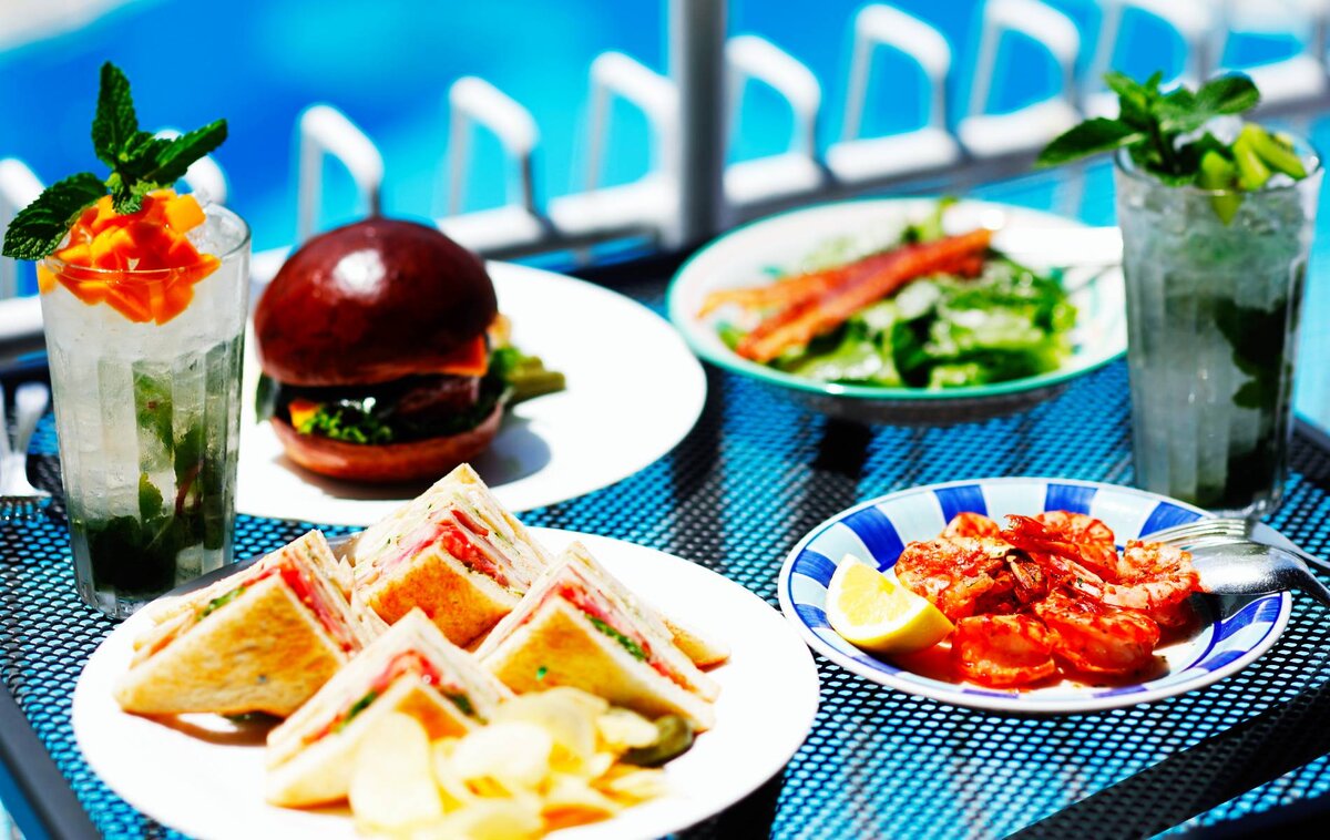 ハンバーガーなどリゾート感あふれるフードメニューや、バーテンダー特製のカクテル・ノンアルコールドリンクが揃い、水着のまま立ち寄れるのが嬉しいポイントです。